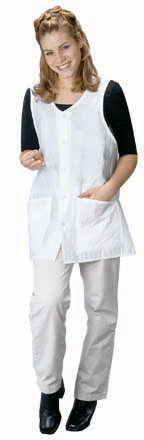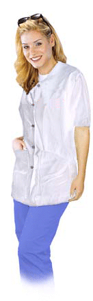 collarless neckline, easy on easy off snaps, shaped side seams for a
